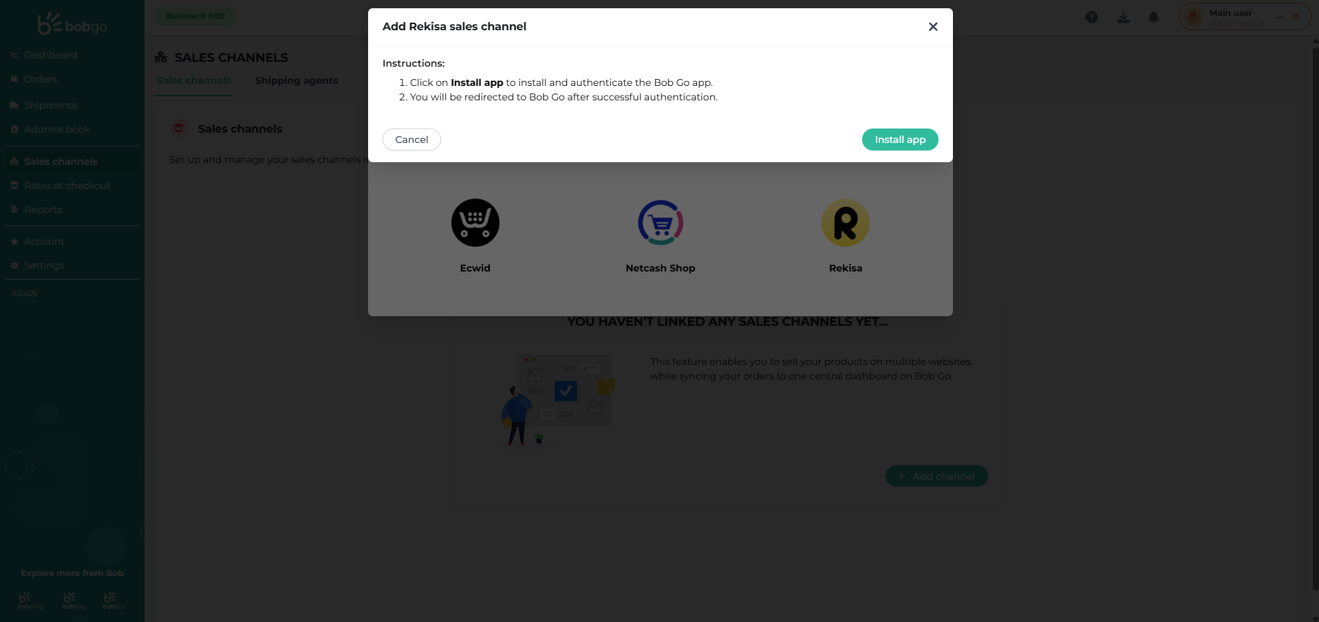 To connect your Ecwid channel to Bob Go: Log in to your Bob Go account. In the left navigation panel, go to Sales channels. Click + Add channel. Select Ecwid from the list of available channels. Click Install app. Install and authenticate the Bob Go ...