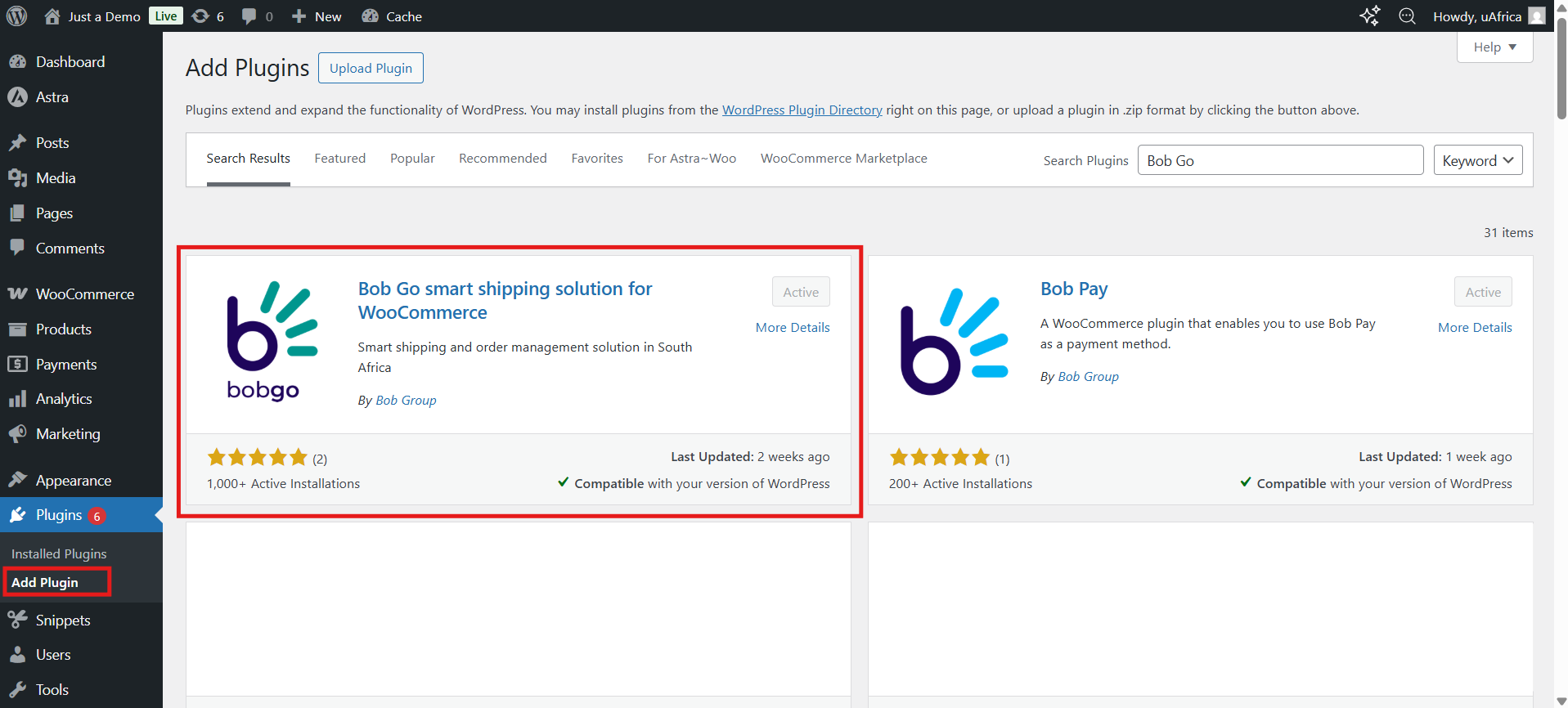Search for "Bob Go smart shipping solution for WooCommerce" (or use the direct link: https://wordpress.org/plugins/uafrica-shipping/).